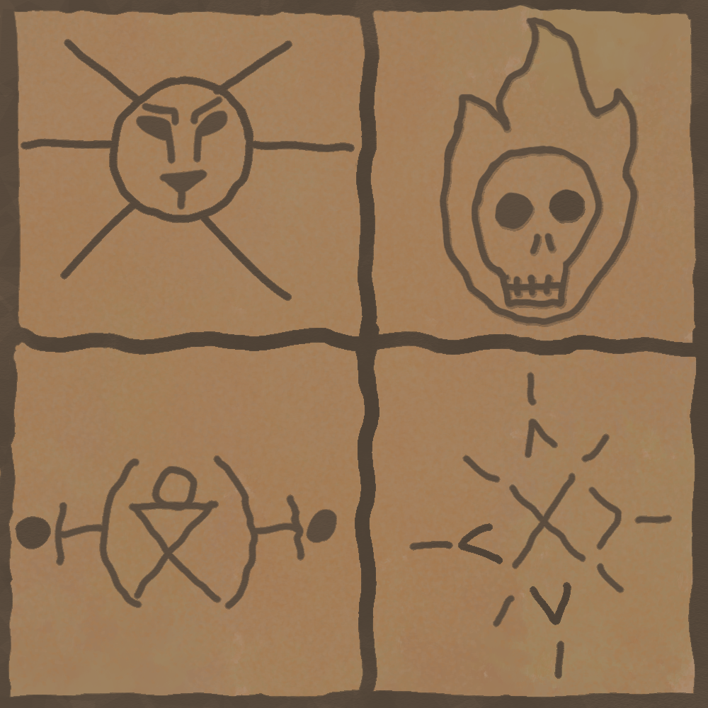 - A collection of leather patches with the 4 most common chierk symbols: the top left means wanting to be left to nature, top right means wanting to be burned, bottom left means wanting to be buried or otherwise concealed, bottom right means they do not care what happens to their body.